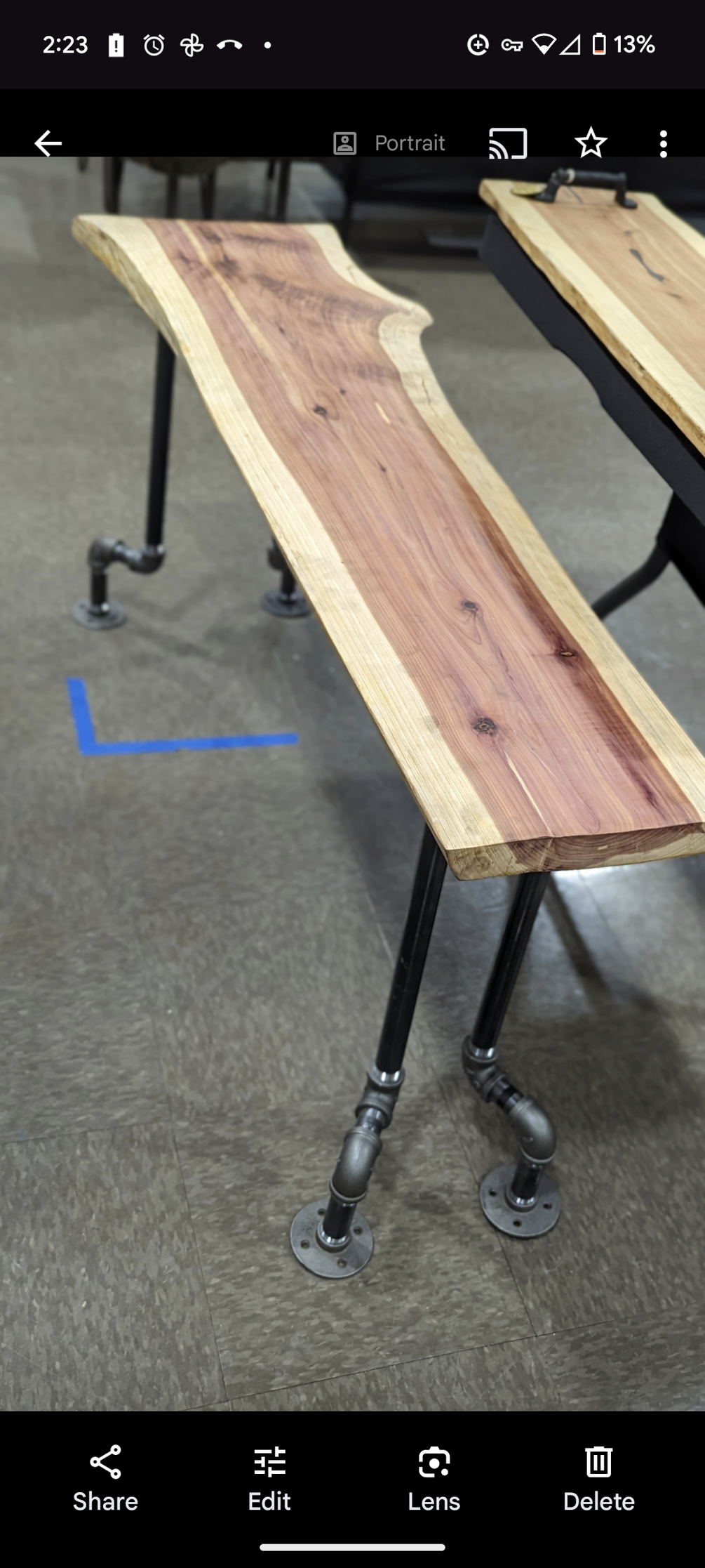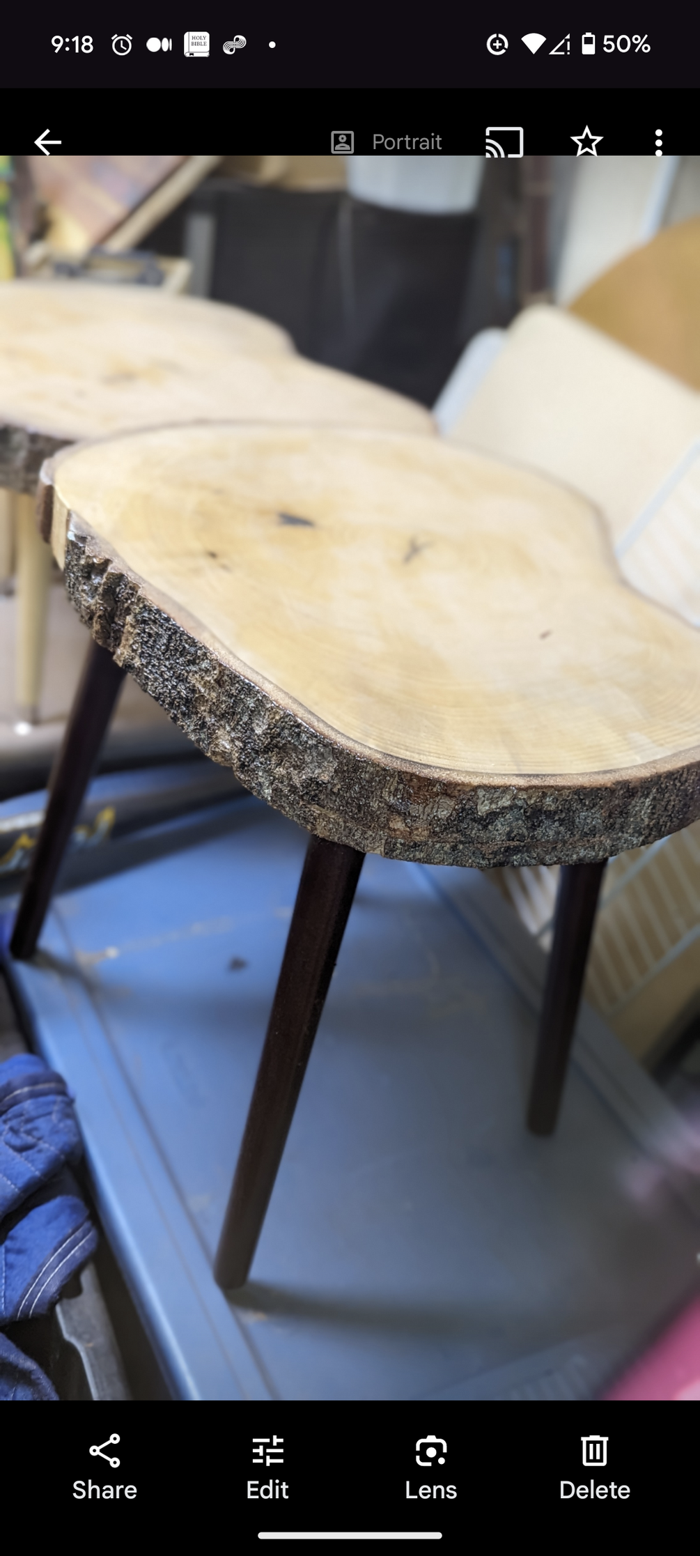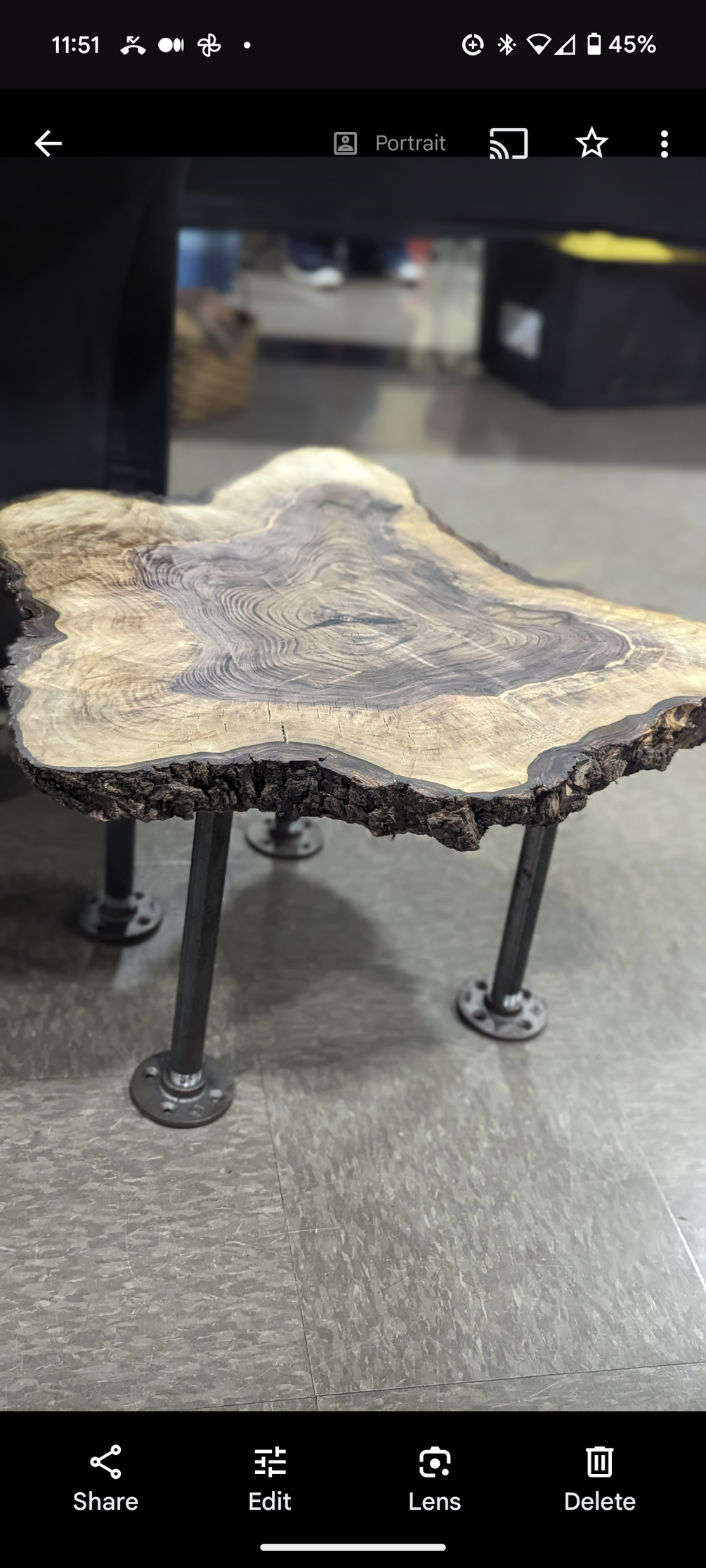 A live edge table, made from cedar, black walnut, oak, pecan, pine andore